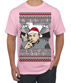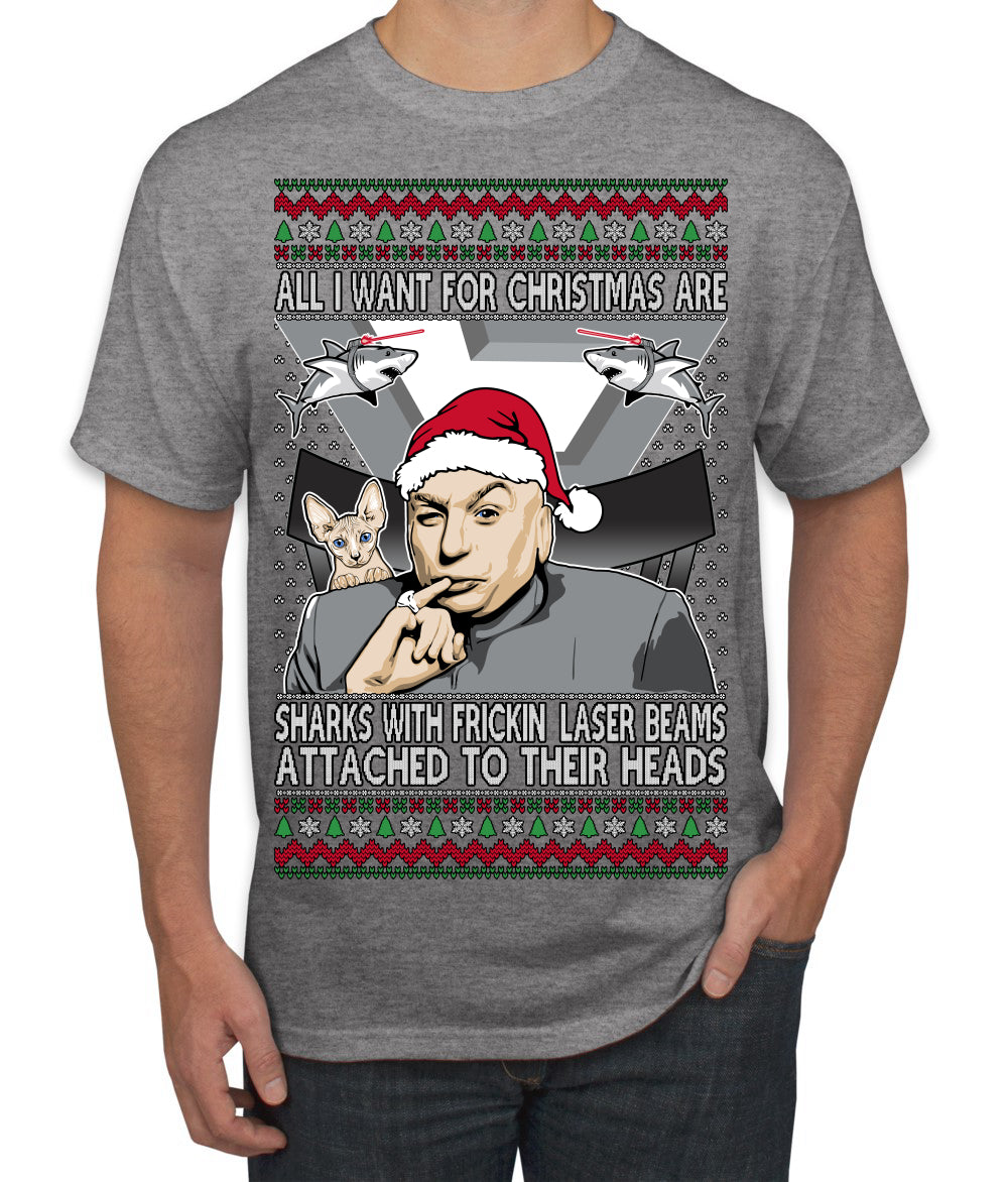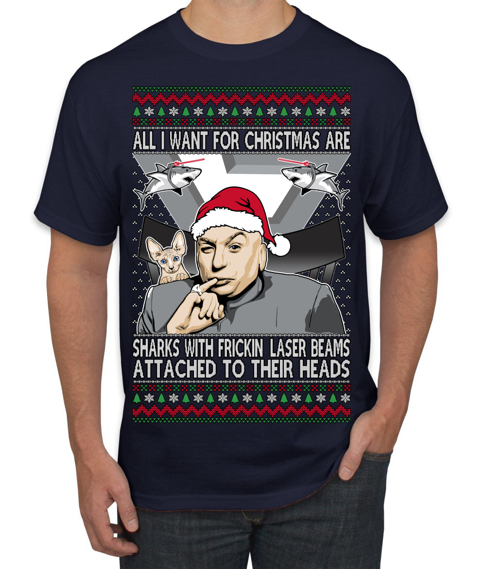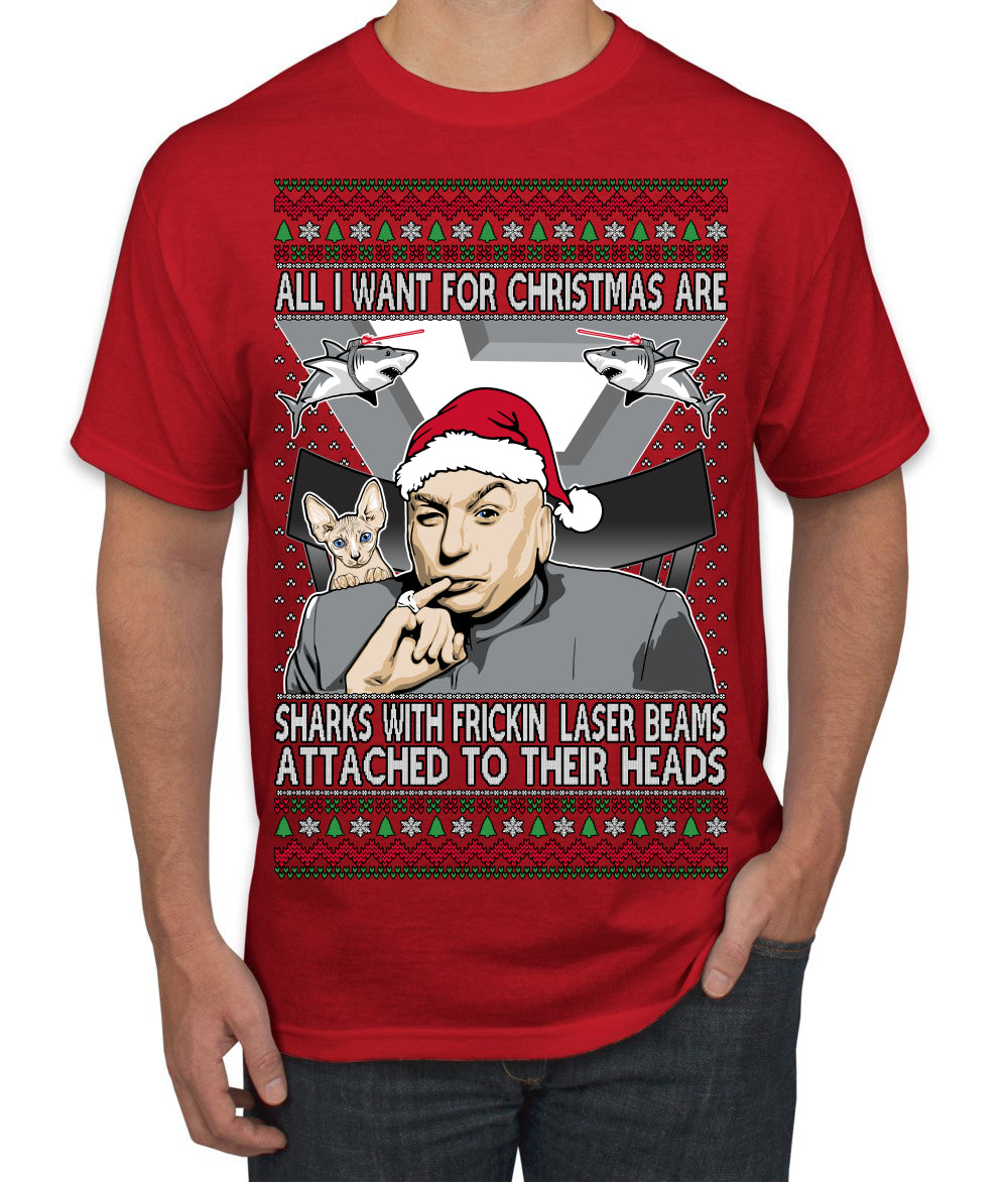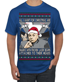 All I Want for Christmas are Sharks With Frickin Laser Beams Attached to their Heads Funny 90s 00s Comedy Movie Ugly Christmas Sweater Men's T-Shirt
