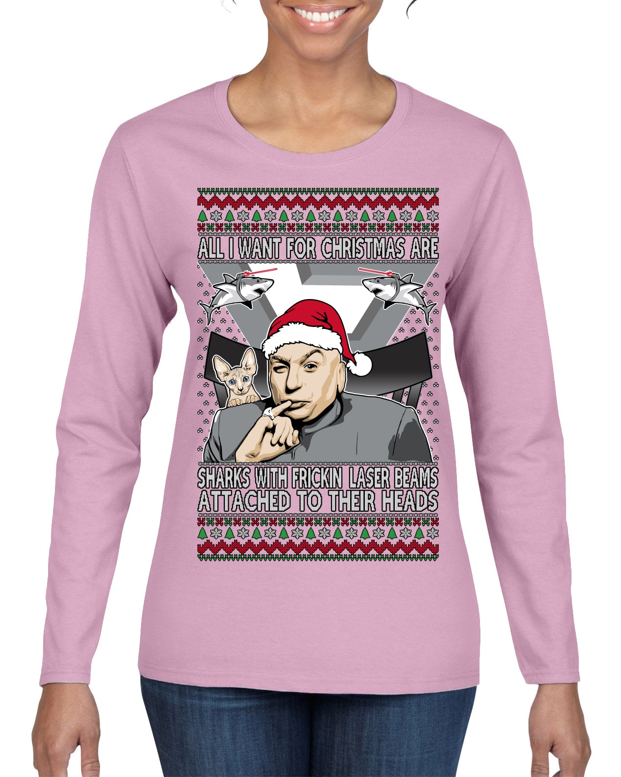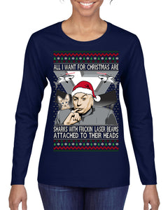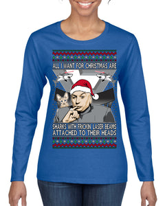 All I Want for Christmas are Sharks With Frickin Laser Beams Attached to their Heads Funny 90s 00s Comedy Movie Ugly Christmas Sweater Womens Graphic Long Sleeve T-Shirt