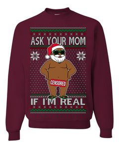 Ask Your Mom If I'm Real Funny Black Santa Claus Censored Ugly Christmas Sweater Crewneck Sweatshirt