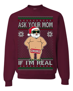 Ask Your Mom If I'm Real Funny Censored Santa Claus Ugly Christmas Sweater Crewneck Sweatshirt