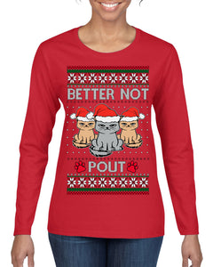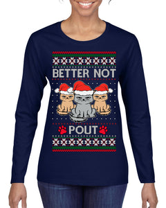 Better Not Pout, Cute Sad Santa Cats | Funny Ugly Christmas Sweater Womens Graphic Long Sleeve T-Shirt