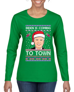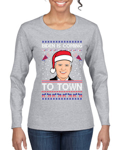 Biden Is Coming To Town Ugly Christmas Sweater Womens Graphic Long Sleeve T-Shirt