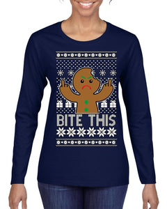 Bite This, Funny Gingerbread Cookie Offensive Inappropriate Middle Finger, F U Ginger Bread Dirty Novelty Xmas Ugly Christmas Sweater Womens Graphic Long Sleeve T-Shirt