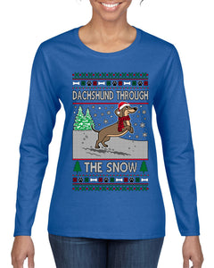 Dachshund Through The Snow, Cute Dog Christmas Sweater, Ugly Christmas Sweater Womens Graphic Long Sleeve T-Shirt