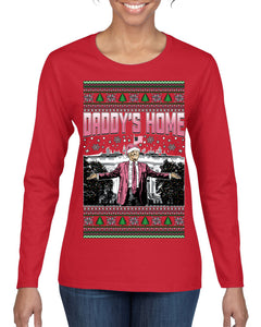 Daddy's Home Pink Suit, I'll Be Home for Christmas | Funny Santa Clause President Donald Trump Ugly Christmas Sweater Womens Graphic Long Sleeve T-Shirt