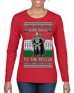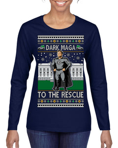 Dark MAGA to the Rescue Elon Superhero Doge Crypto Ugly Christmas Sweater Womens Graphic Long Sleeve T-Shirt