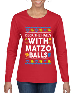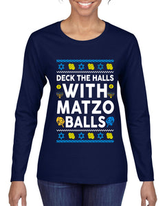 Deck The Halls With Matzo Balls Hanukkah, Ugly Christmas Sweater Womens Graphic Long Sleeve T-Shirt
