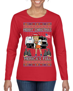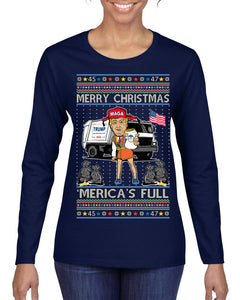 Donald Trump Merry Christmas Merica's Full Garbage Truck Ugly Christmas Sweater Womens Graphic Long Sleeve T-Shirt
