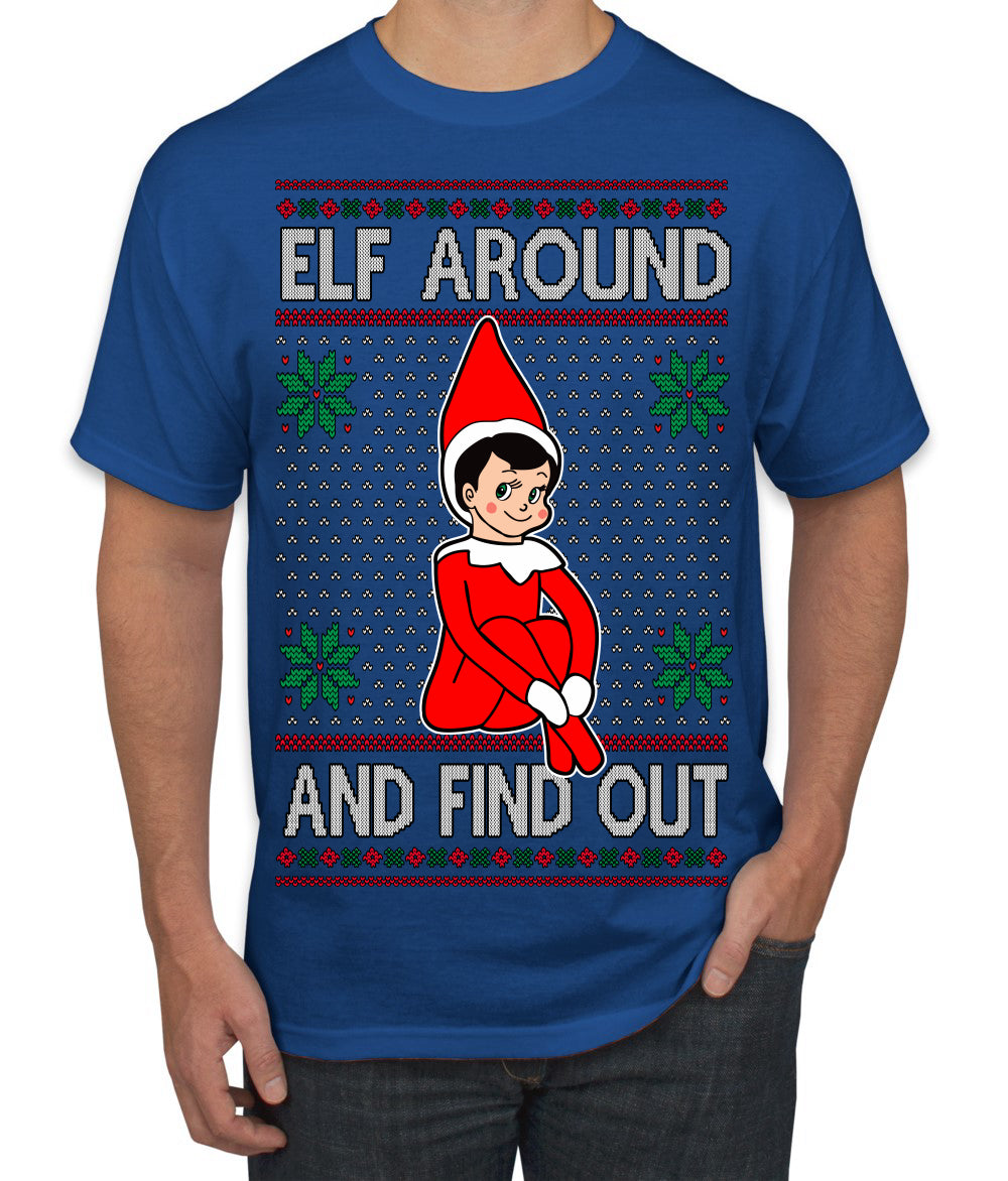 Elf Around and Find Out Funny Gift Toy on a Shelf, Classic Viral Winter Holidays Xmas Meme Ugly Christmas Sweater Men's T-Shirt