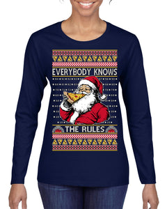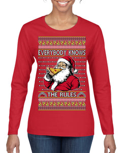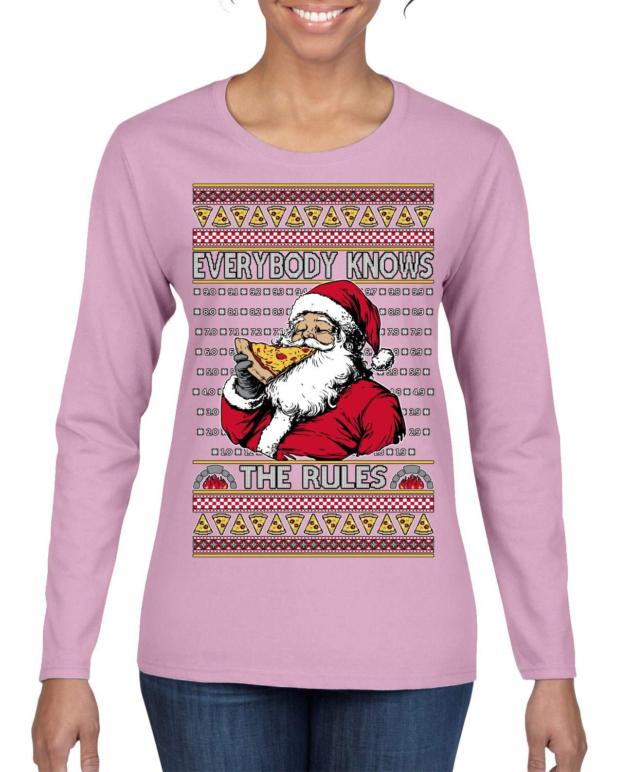 Everybody Knows the Rules Funny Santa Claus Pizza Score Ugly Christmas Sweater Womens Graphic Long Sleeve T-Shirt