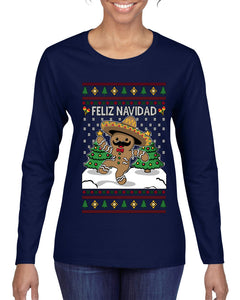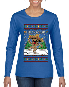 Feliz Navidad Dancing Gingerbread Man, Ugly Christmas Sweater Womens Graphic Long Sleeve T-Shirt