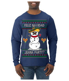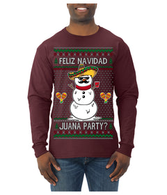 Feliz Navidad Juana Party Funny Spanish Drinking Cerveza Ugly Christmas Sweater Mens Long Sleeve Shirt