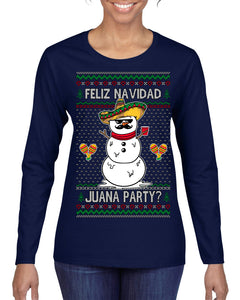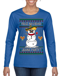 Feliz Navidad Juana Party Funny Spanish Drinking Cerveza Ugly Christmas Sweater Womens Graphic Long Sleeve T-Shirt