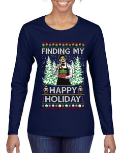 Finding My Happy Holiday, Ugly Christmas Sweater Womens Graphic Long Sleeve T-Shirt