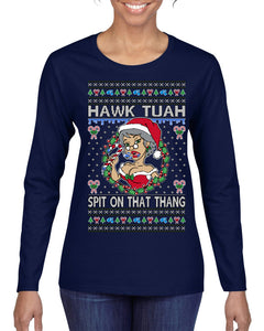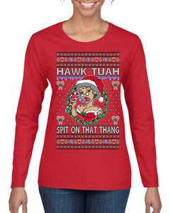 Hawk Tuah Spit On That Thang Mrs Claus Funny Meme Ugly Christmas Sweater Womens Graphic Long Sleeve T-Shirt