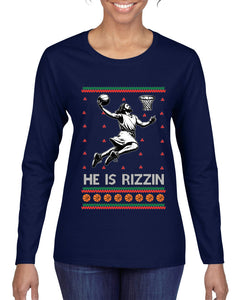 He Is Rizzin, Ugly Christmas Sweater Womens Graphic Long Sleeve T-Shirt