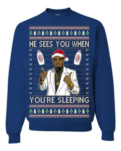 He Sees You When You're Sleeping, Funny Santa P Diddy Diddler Funny Party Viral Music Baby Oil Meme Ugly Christmas Sweater Crewneck Sweatshirt