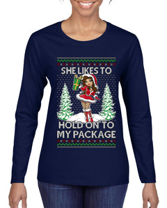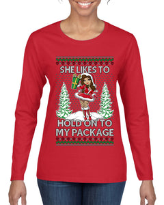 Hold My Package, Ugly Christmas Sweater Womens Graphic Long Sleeve T-Shirt