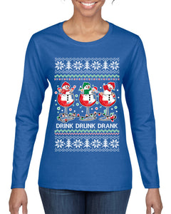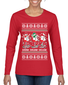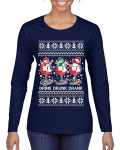 Holiday Spirits Drink Drank Drunk Snowmen Ugly Christmas Sweater Womens Graphic Long Sleeve T-Shirt