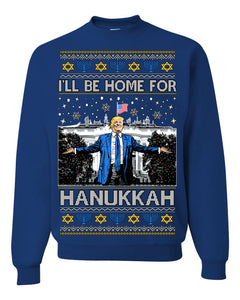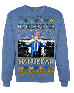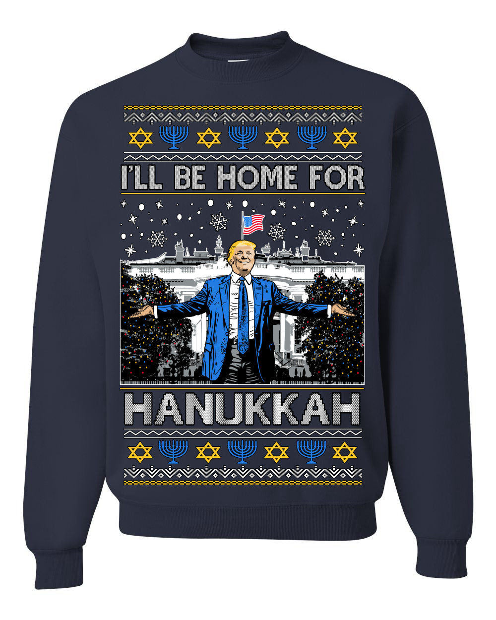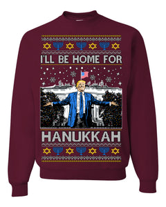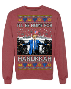I'll Be Home for Hanukkah, Funny President Donald Trump JD Vance Winter Holiday Chanukah Hannukkah Channukah Ugly Christmas Sweater Crewneck Sweatshirt
