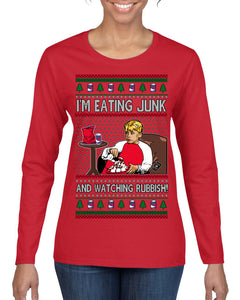 I'm Eating Junk and Watching Rubbish 90s Movie Ice Cream Ugly Christmas Sweater Womens Graphic Long Sleeve T-Shirt