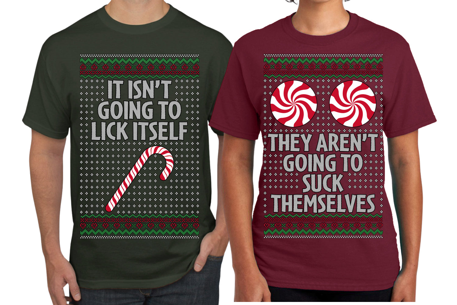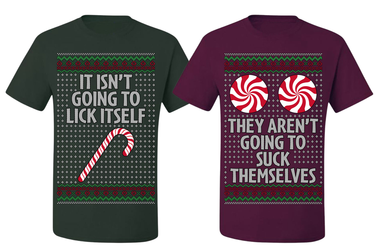 It Isn't Going to Lick Itself Candy Cane They Won't Suck Themselves Funny Couples Shirt Girlfriend Boyfriend Gift His and Hers Matching Ugly Christmas Couple T-Shirt