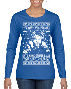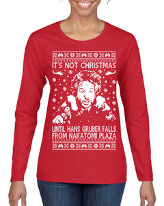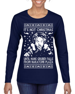 It's Not Christmas Until Hans Gruber Falls From Nakatomi Plaza White Ugly Christmas Sweater Womens Graphic Long Sleeve T-Shirt