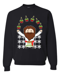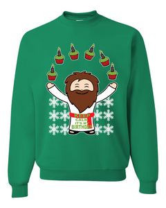 Keep Calm It's My Birthday Funny Jesus Juggling Cupcakes Merry Ugly Christmas Sweater Unisex Crewneck Graphic Sweatshirt