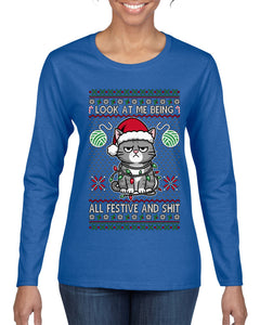 Look At Me Being All Festive And Shit, Ugly Christmas Sweater Womens Graphic Long Sleeve T-Shirt