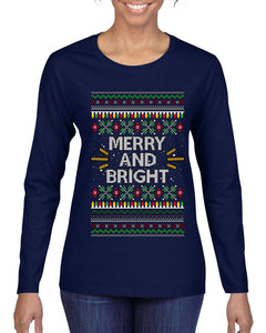 Merry And Bright, Ugly Christmas Sweater Womens Graphic Long Sleeve T-Shirt