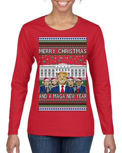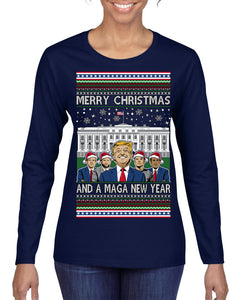 Merry Christmas and a MAGA New Year 2025 Ugly Christmas Sweater Womens Graphic Long Sleeve T-Shirt