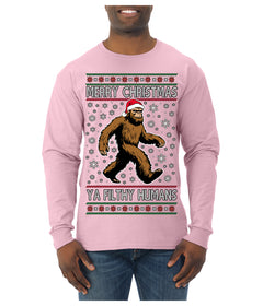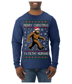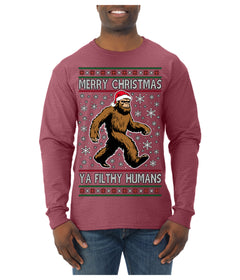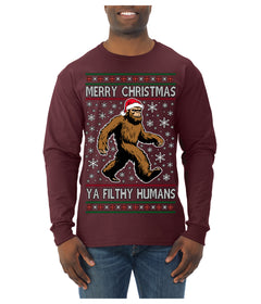 Merry Christmas Ya Filthy Humans Funny Sasquatch Bigfoot Ugly Christmas Sweater Mens Long Sleeve Shirt