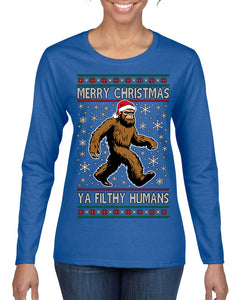 Merry Christmas Ya Filthy Humans Funny Sasquatch Bigfoot Ugly Christmas Sweater Womens Graphic Long Sleeve T-Shirt