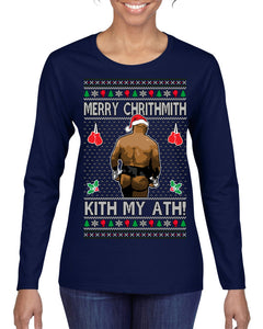 Merry Chrithmith Kith My Ath, Butt Viral Kiss My Ass Boxing Fight Meme Ugly Christmas Sweater Womens Graphic Long Sleeve T-Shirt