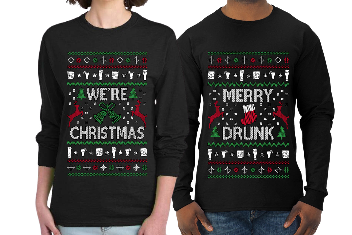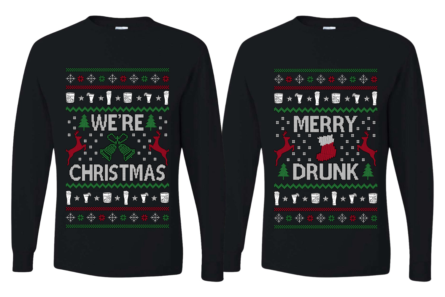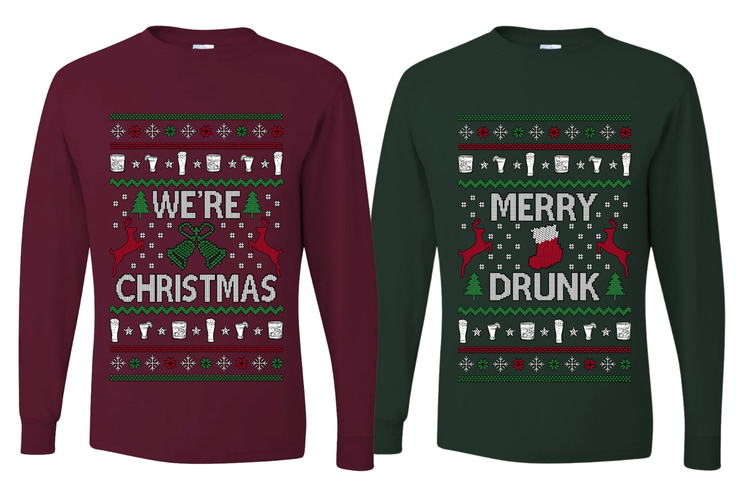 Merry Drunk We're Christmas Sweater Girlfriend Boyfriend Gift His and Hers Matching Ugly Christmas Couple Long Sleeve Shirt