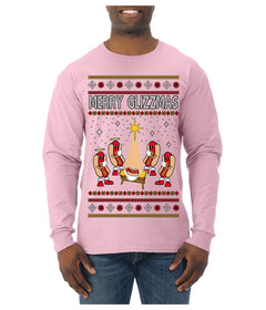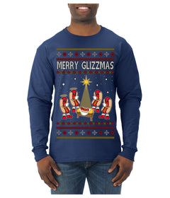 Merry Glizzmas, Funny Glizzy Hot Dog Baby Jesus Catholic Nativity, Fast Food Mustard Condiment Glizzys Humor Ugly Christmas Sweater Mens Long Sleeve Shirt