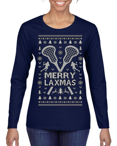Merry Laxmas Funny Lacrosse Sports LAX Teen Sports Pun Ugly Christmas Sweater Womens Graphic Long Sleeve T-Shirt