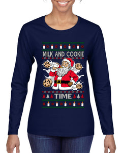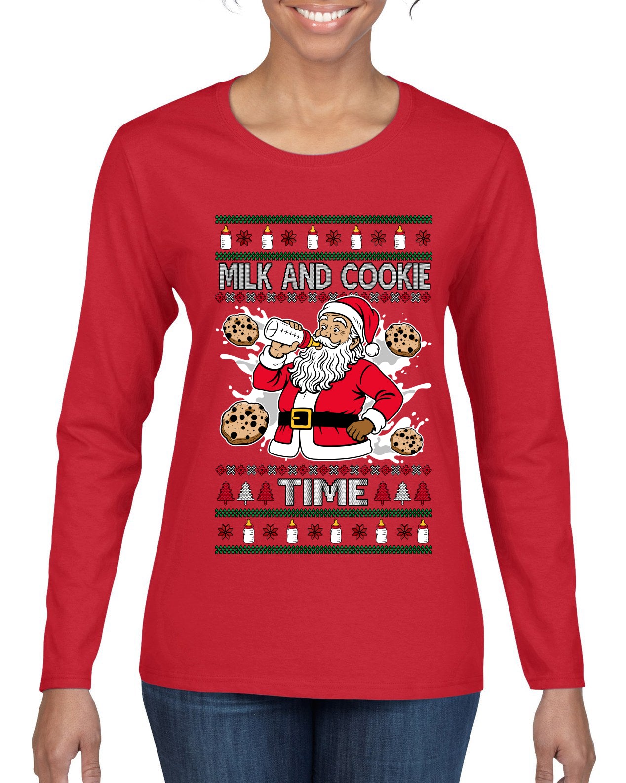Milk And Cookie Time, Ugly Christmas Sweater Womens Graphic Long Sleeve T-Shirt