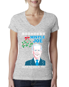Mistle Joe Shut Up And Kiss Me Man Biden Ugly Christmas Sweater Womens Junior Fit V-Neck Tee