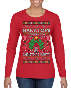 Nakatomi Corporation Christmas Party 1988 Plaza Logo, Classic Die Hard McClane 80s Xmas Movie Quote Ugly Christmas Sweater Womens Graphic Long Sleeve T-Shirt