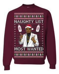 Naughty List Most Wanted, Funny Santa P Diddy Diddler Funny Party Viral Music Baby Oil Meme Ugly Christmas Sweater Crewneck Sweatshirt