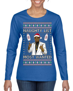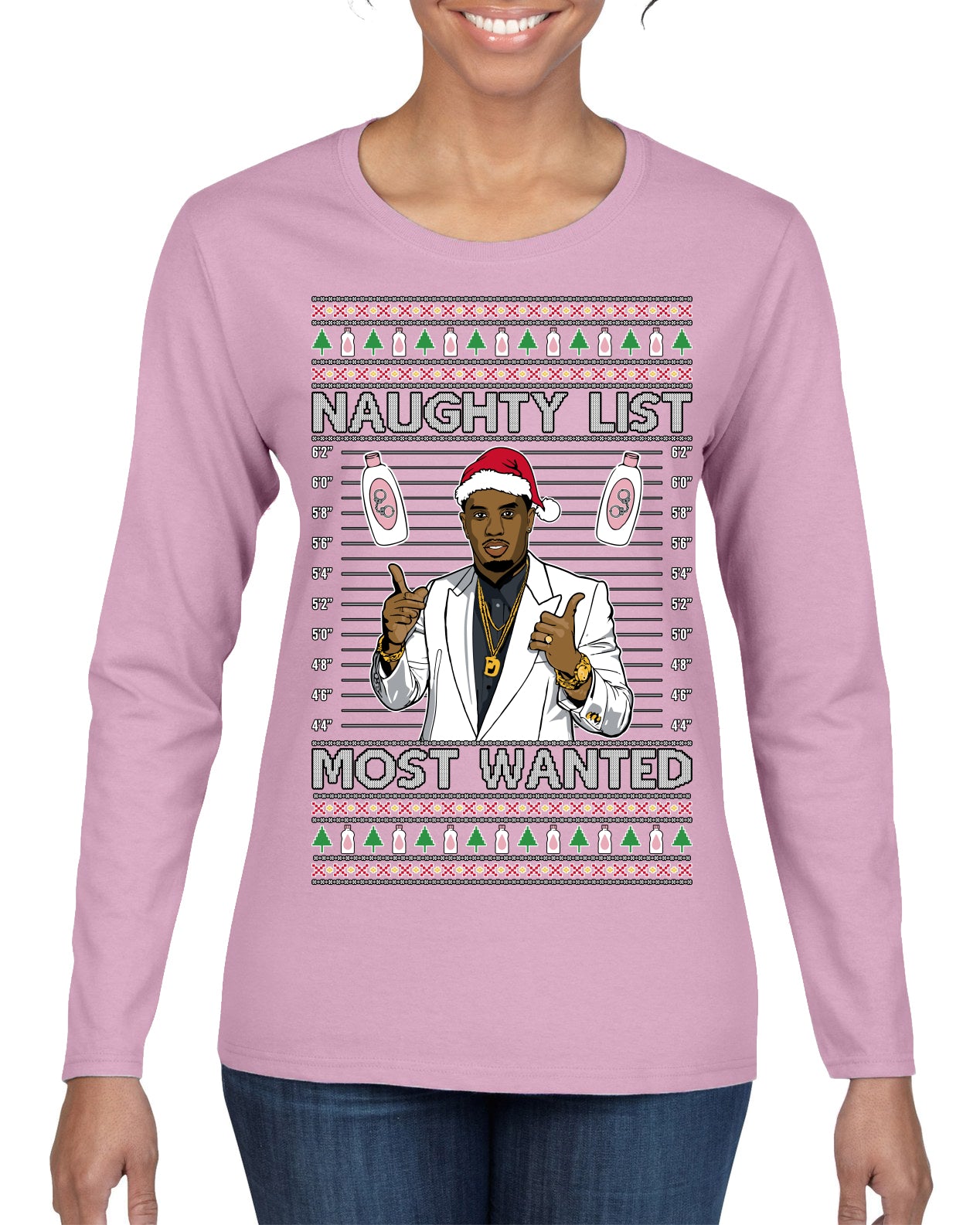 Naughty List Most Wanted, Funny Santa P Diddy Diddler Funny Party Viral Music Baby Oil Meme Ugly Christmas Sweater Womens Graphic Long Sleeve T-Shirt