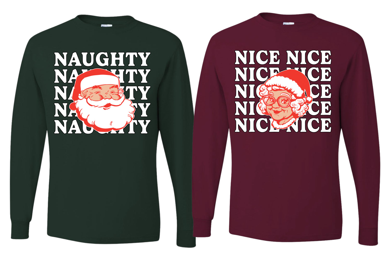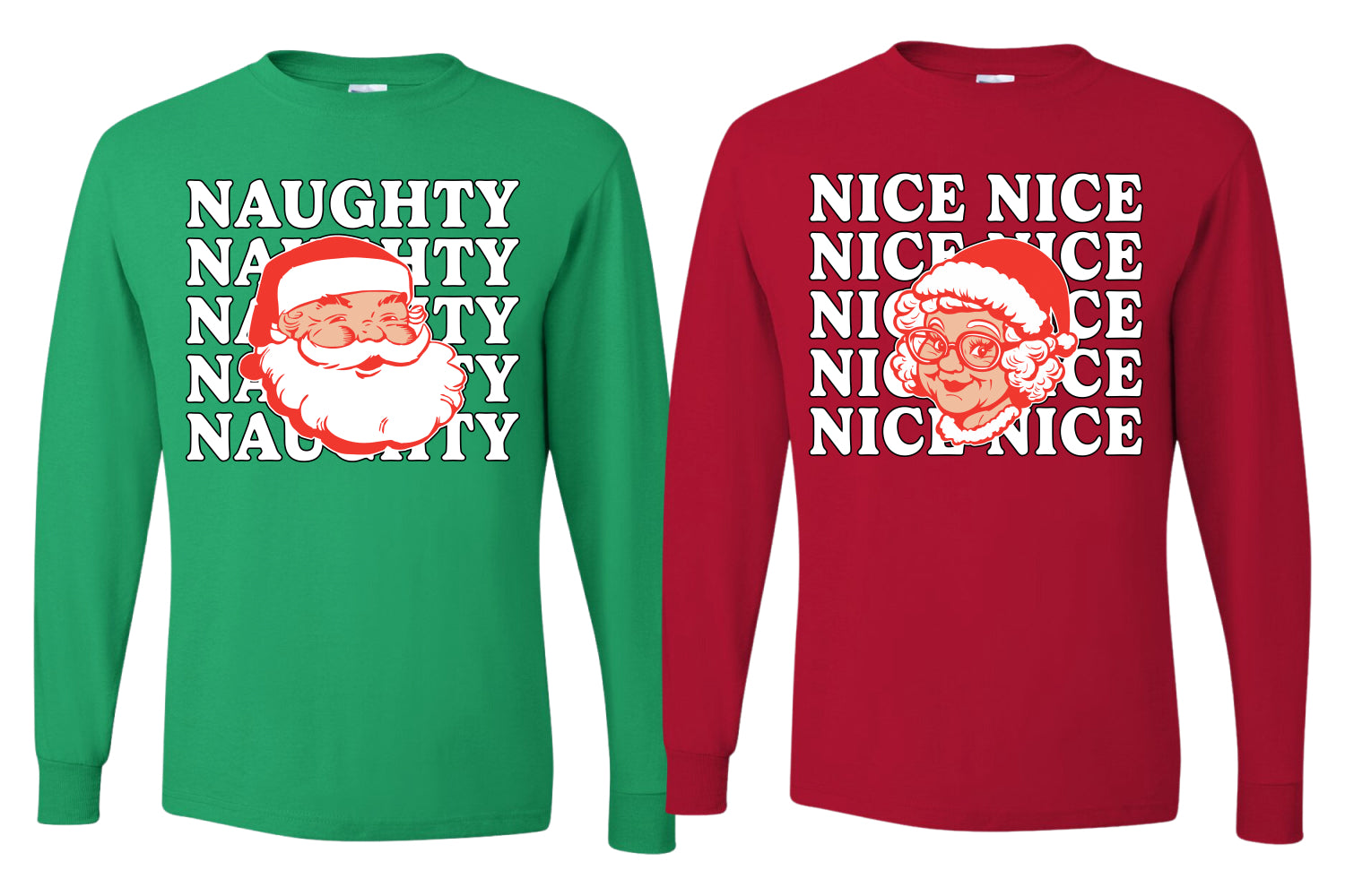 Naughty, Nice Santa Claus Mrs Claus Couples Shirt Girlfriend Boyfriend Gift His and Hers Matching Ugly Christmas Couple Long Sleeve Shirt
