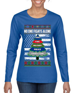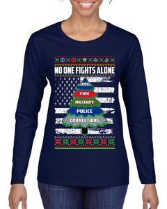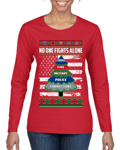 No One Fights Alone Holiday First Responder Police Fire Emt Ugly Christmas Sweater Womens Graphic Long Sleeve T-Shirt