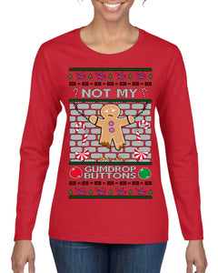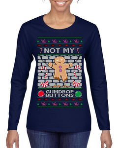 Not My Gumdrop Buttons Funny Classic Movie Quote Ugly Christmas Sweater Womens Graphic Long Sleeve T-Shirt