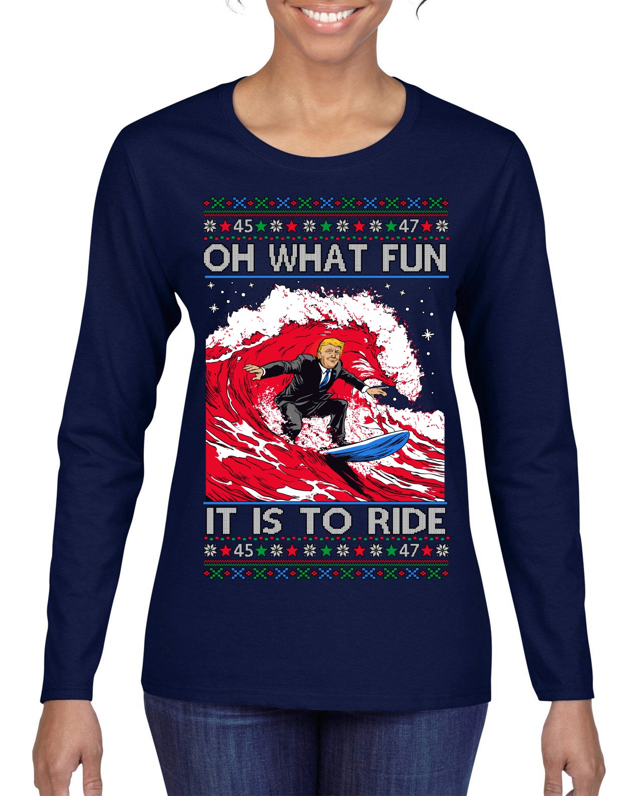 Oh What Fun It Is to Ride Donald Trump Red Wave Landslide Ugly Christmas Sweater Womens Graphic Long Sleeve T-Shirt