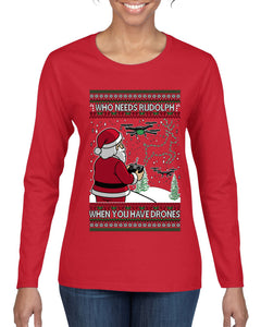 Santa Drone Show Reindeer, Ugly Christmas Sweater Womens Graphic Long Sleeve T-Shirt