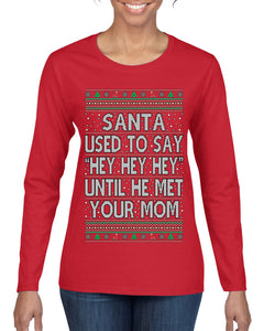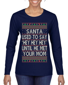 Santa Used To Say Hey Until He Met Your Mom Ugly Christmas Sweater Womens Graphic Long Sleeve T-Shirt