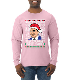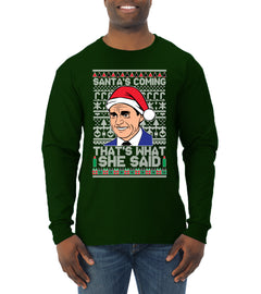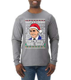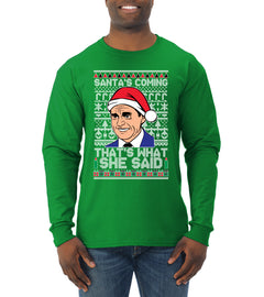 Santas Coming That's What She Said Michael Scott Ugly Christmas Sweater Mens Long Sleeve Shirt