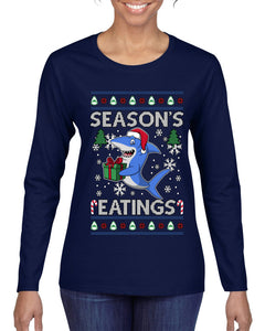 Season's Eatings Shark, Ugly Christmas Sweater Womens Graphic Long Sleeve T-Shirt